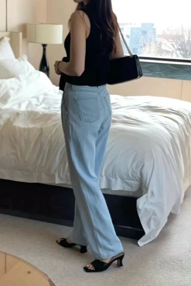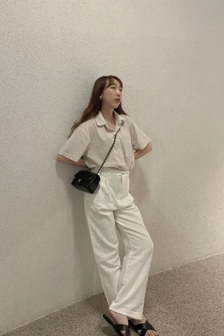 色系走一個淺淺淡淡的陽光夏日感 淺藍和白都很適合溫柔的小姊姊著用!! 超愛這款的布料是夏季用料 薄薄的走路又涼快又軟 重點是白色不會透!! 寬度中等 很顯腿的細長感 簡單搭配涼鞋就很歐膩感🌼👒 尺寸 S size:腰寬32/臀寬50/大腿寬27/褲管寬22.5/褲襠長33/全長103