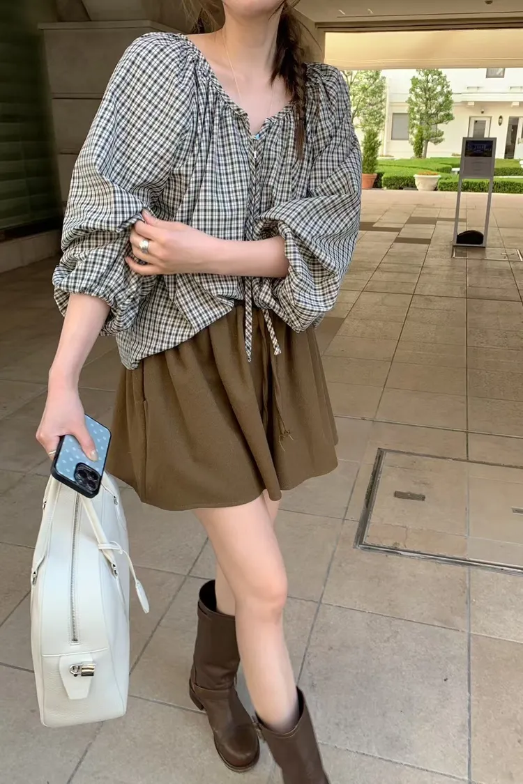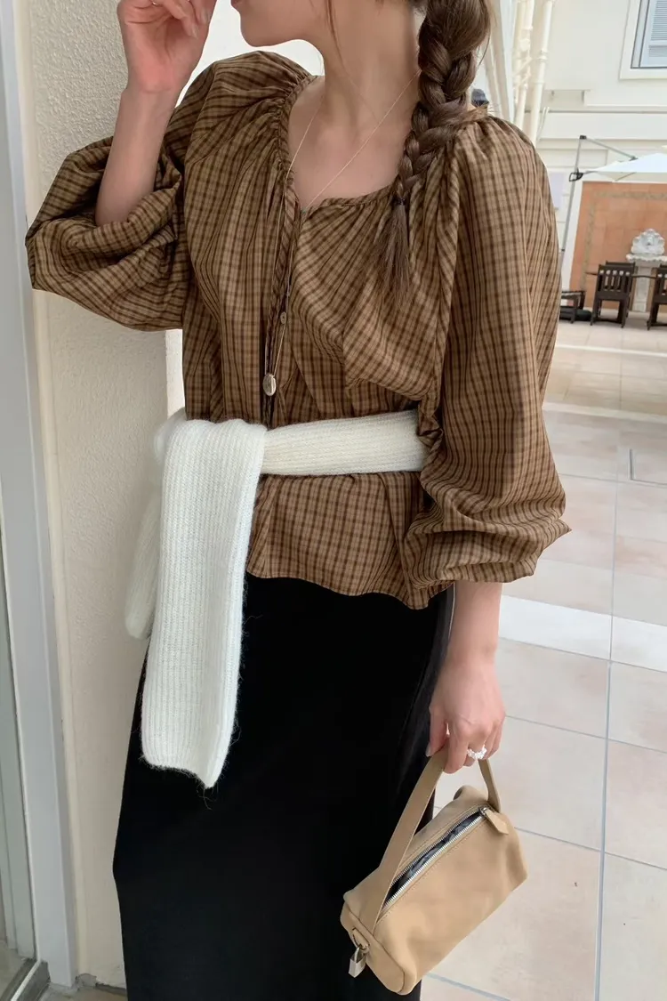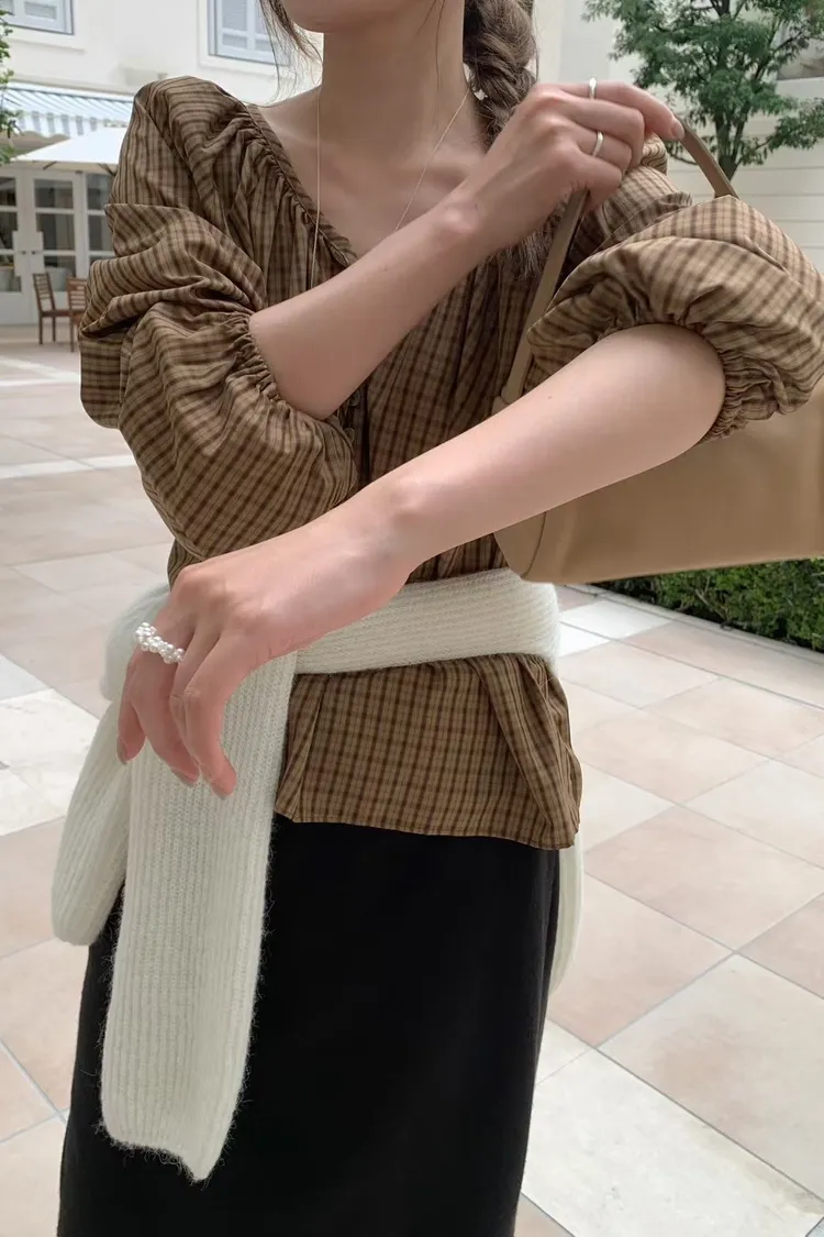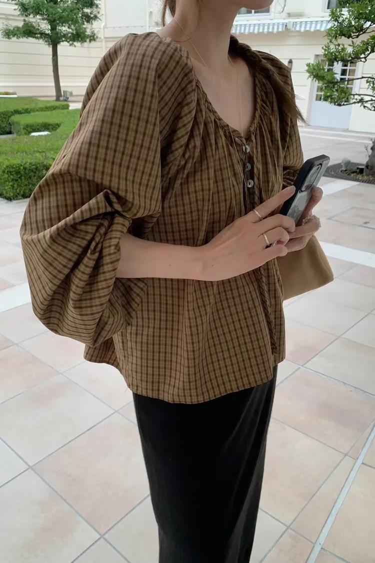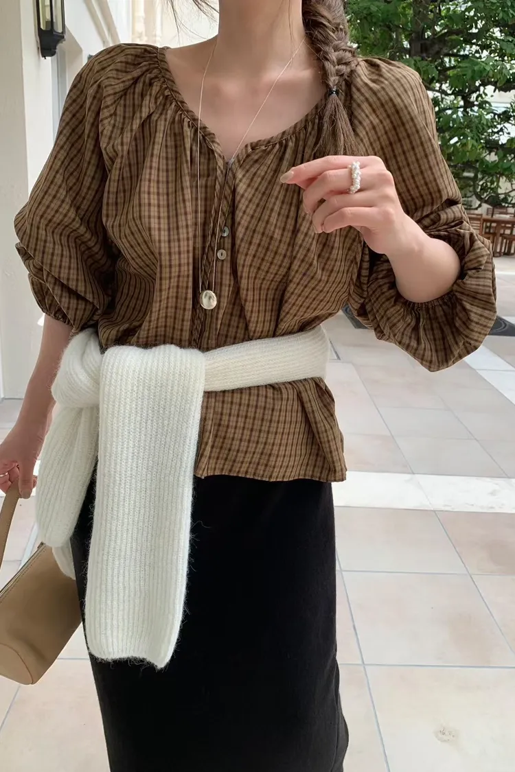維亞那格紋小澎袖氣質上衣