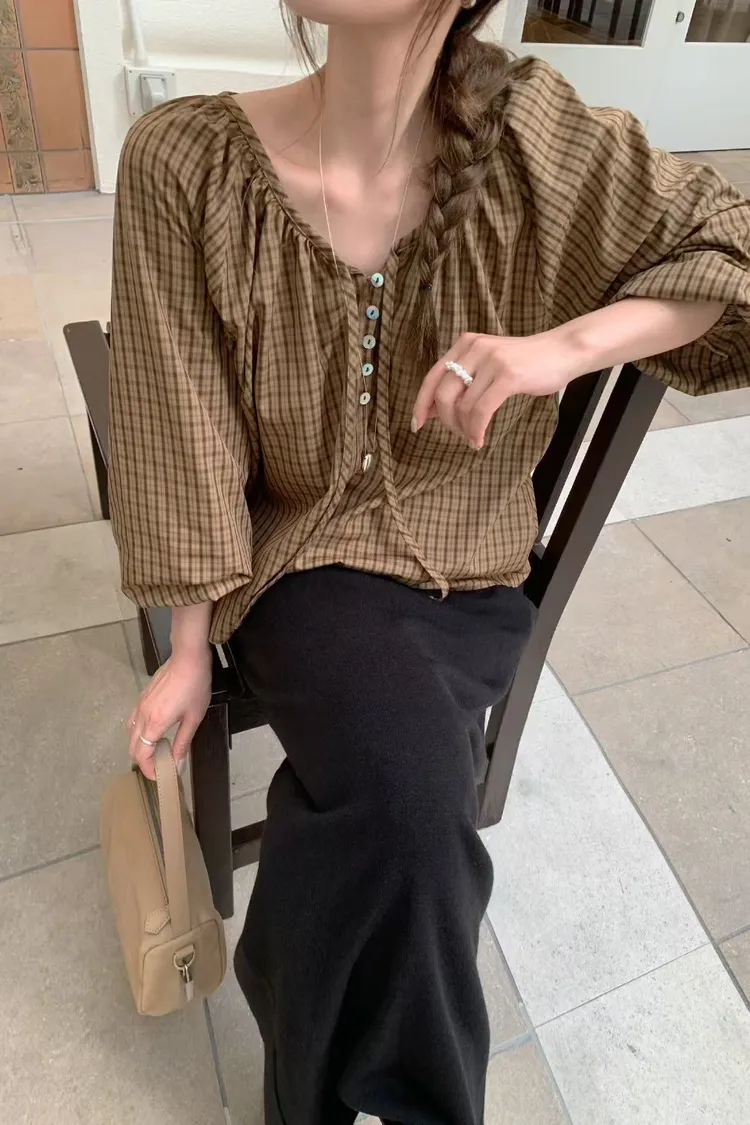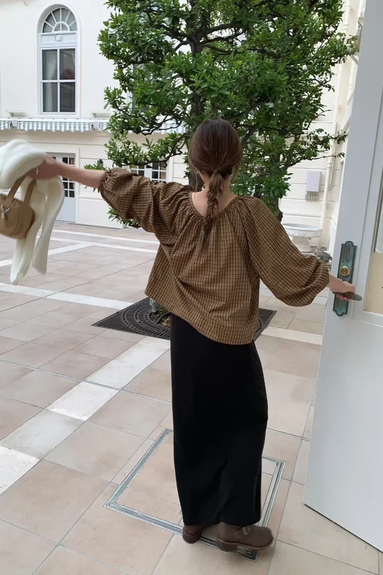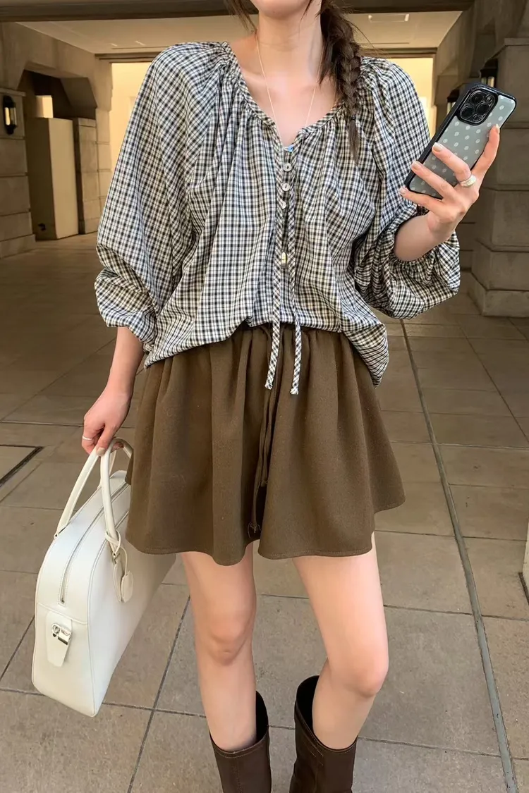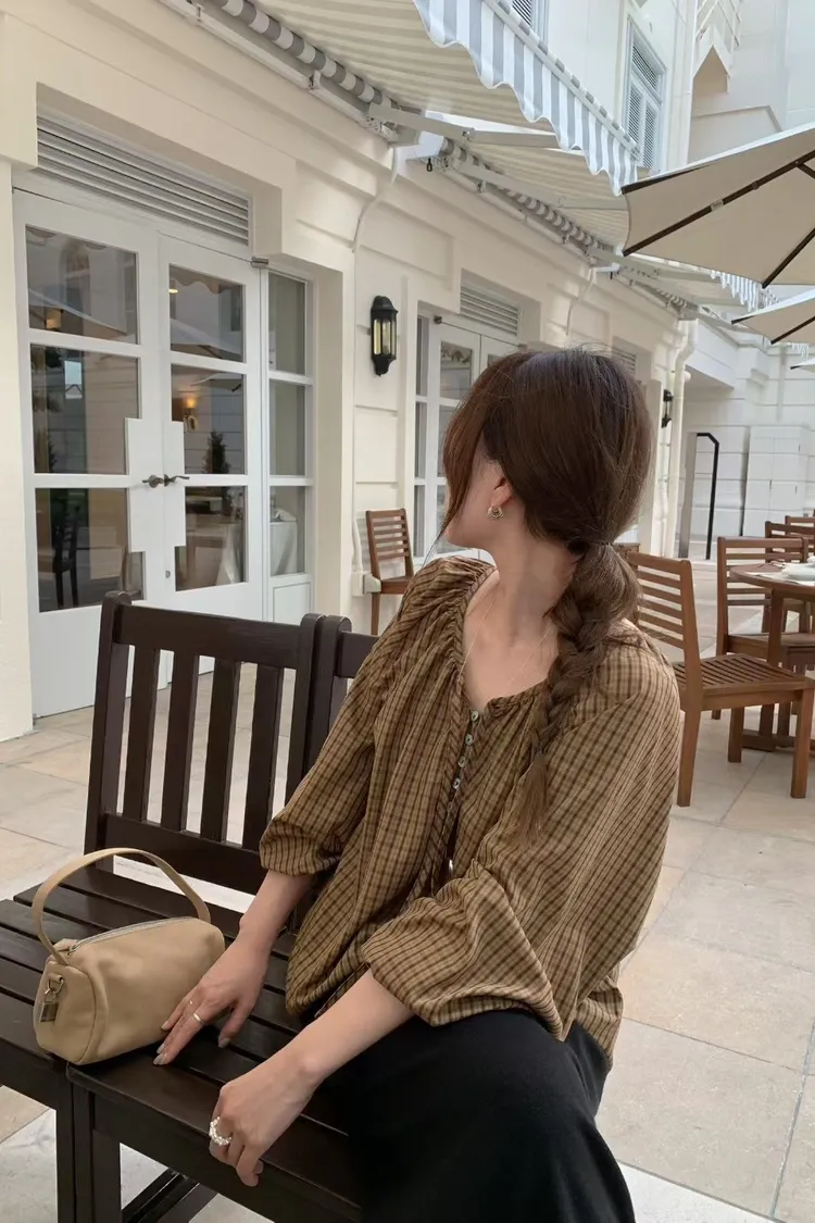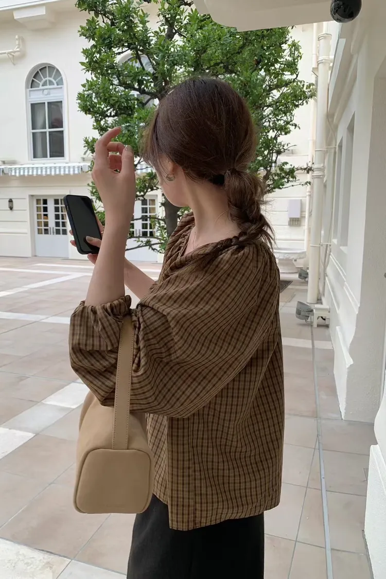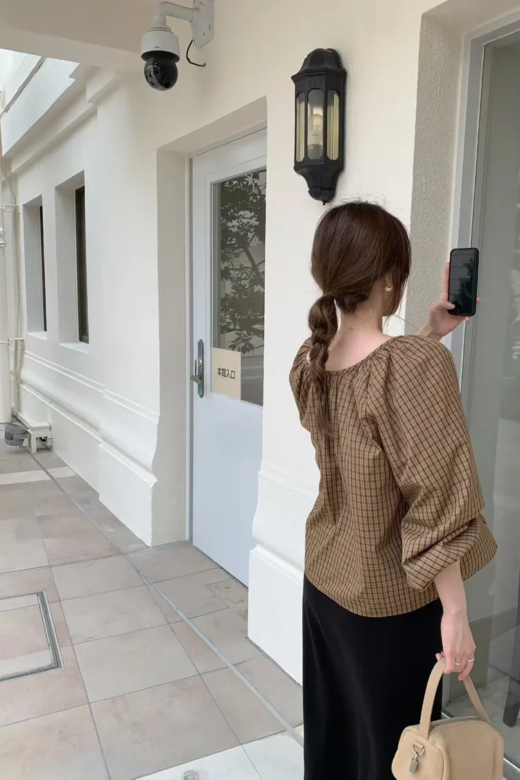 維亞那格紋小澎袖氣質上衣