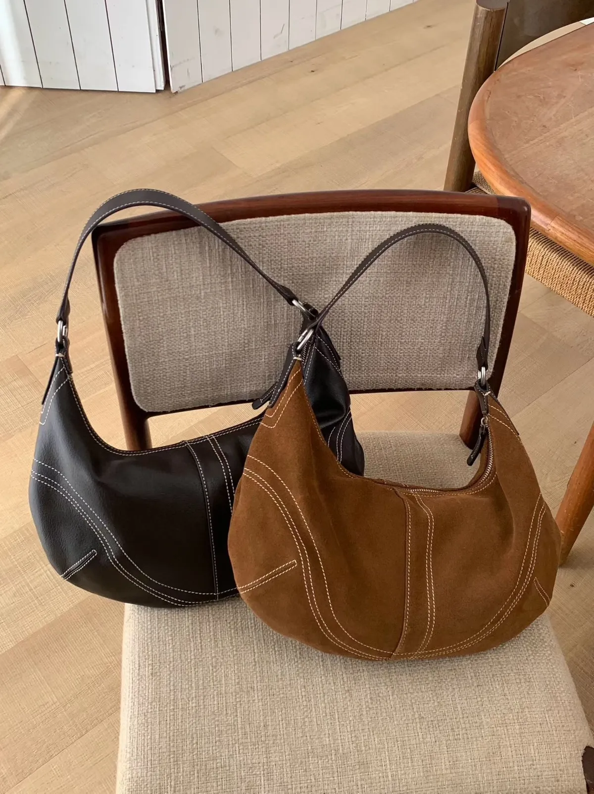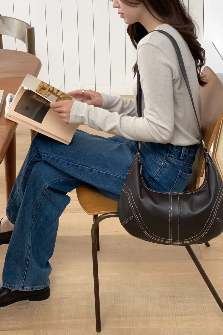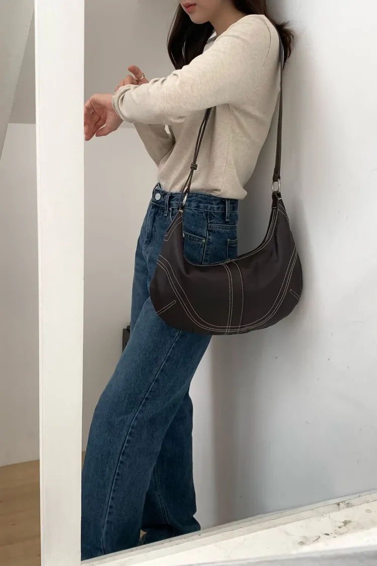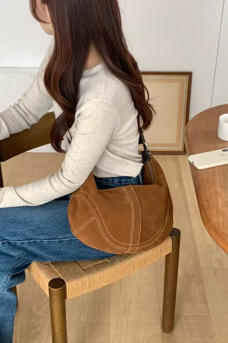 麂皮感俐落線條弧形肩背包