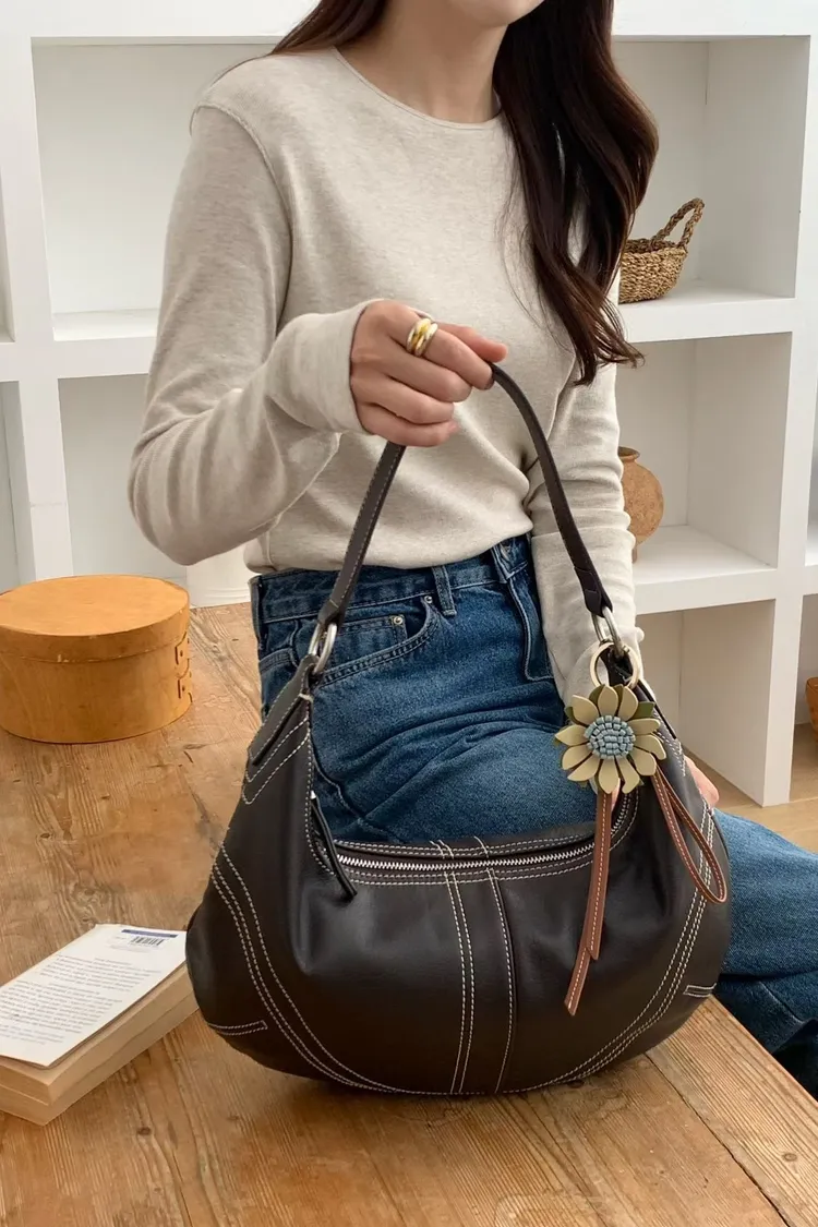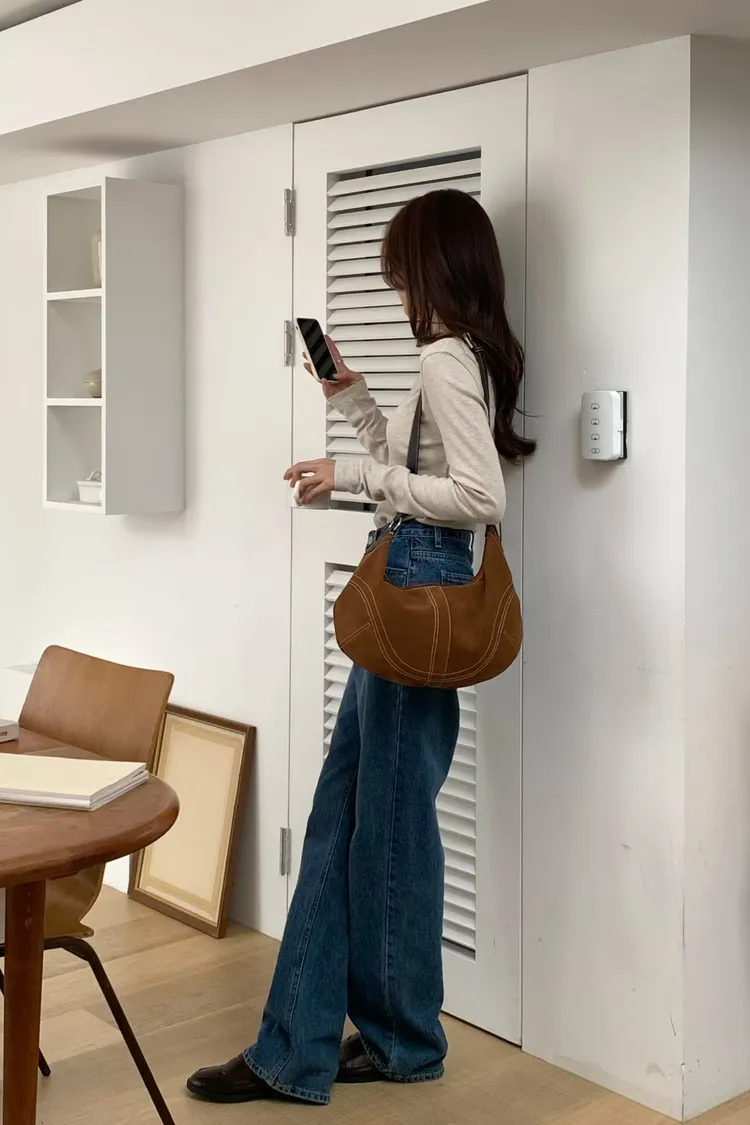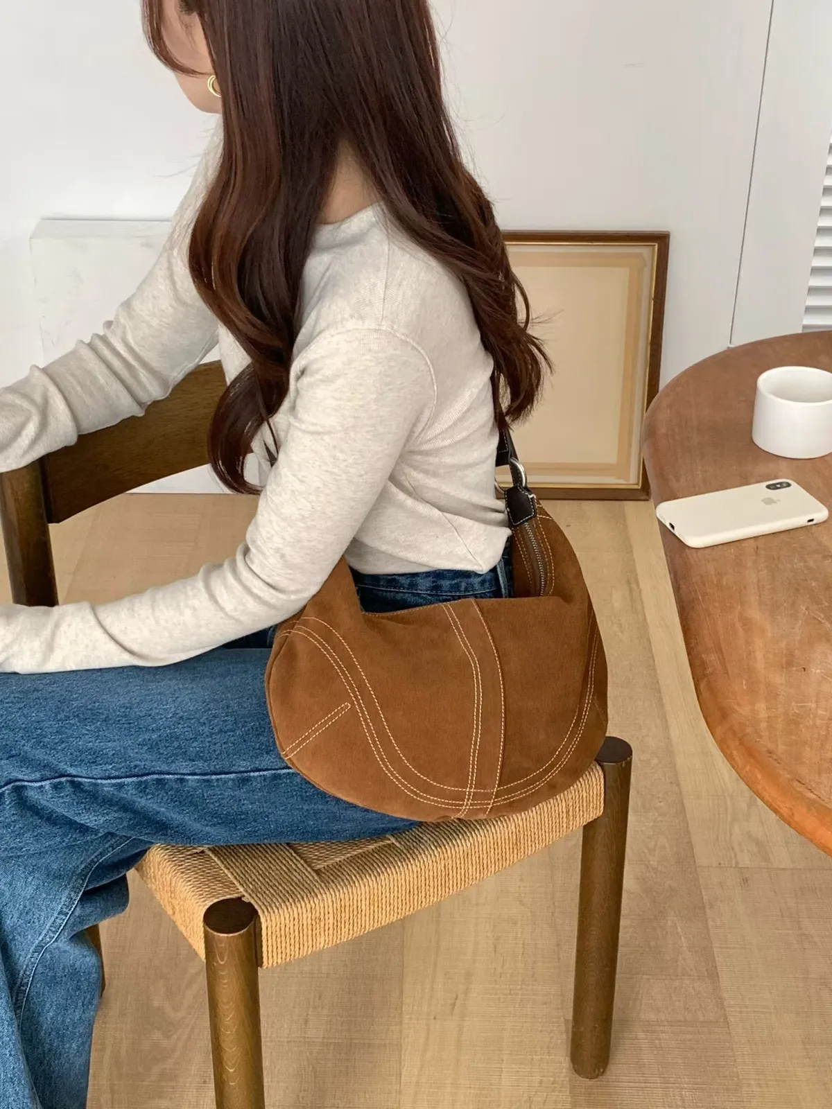 麂皮感俐落線條弧形肩背包