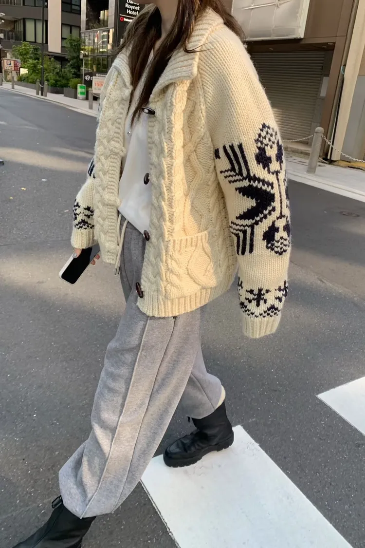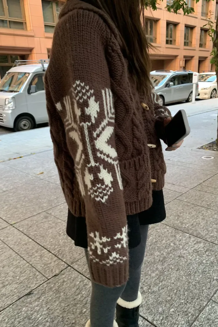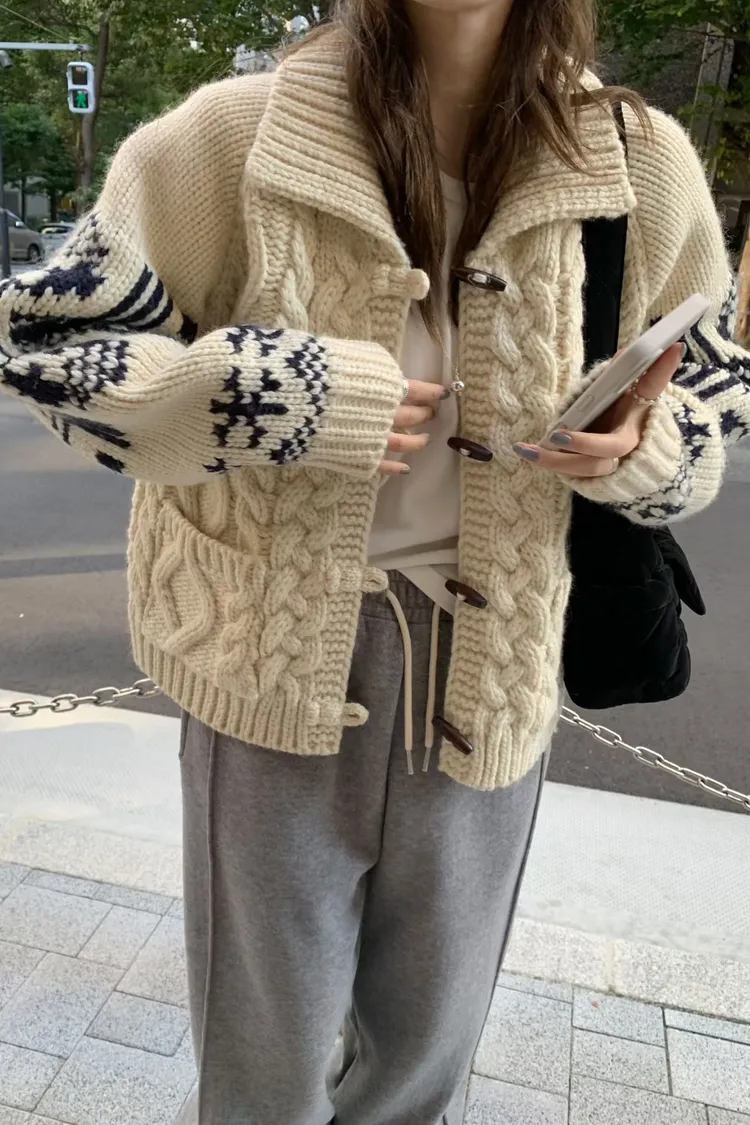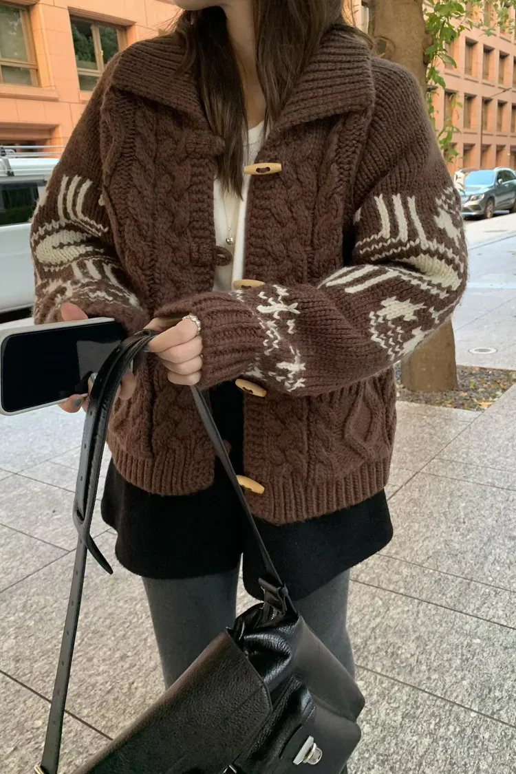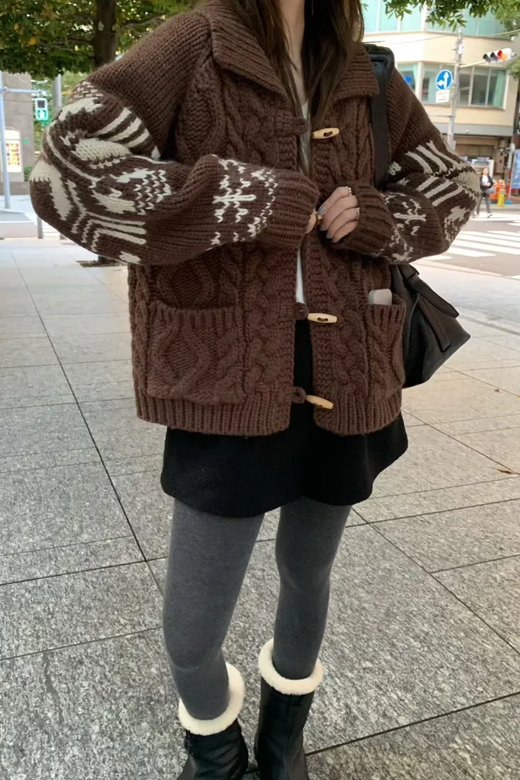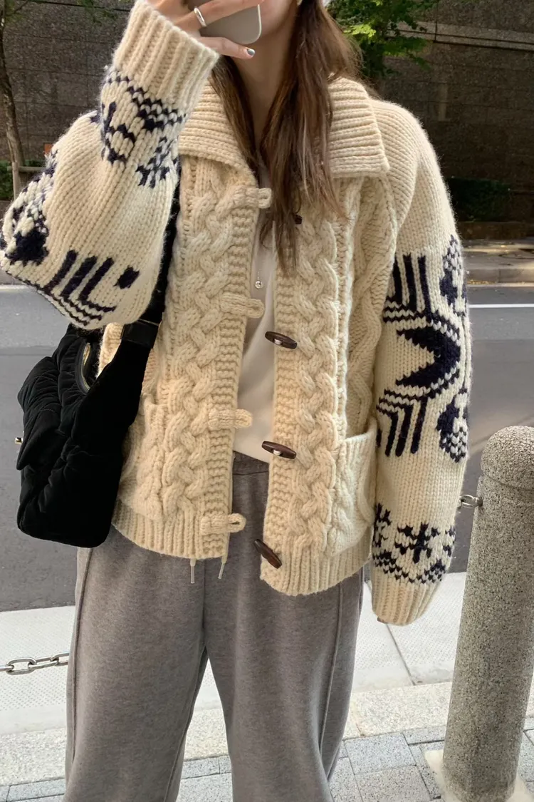 尺寸 胸55/長57 重量 1.4kg 材質 羊毛50% 「咖啡牛奶麻花圖騰羊毛外套」 咖啡牛奶色真的太療癒🤎🤍 有口袋、麻花與圖騰交錯超精緻,厚度剛剛好又不會顯胖 穿起來是那種「很會穿但又不故意」的法式慵懶感