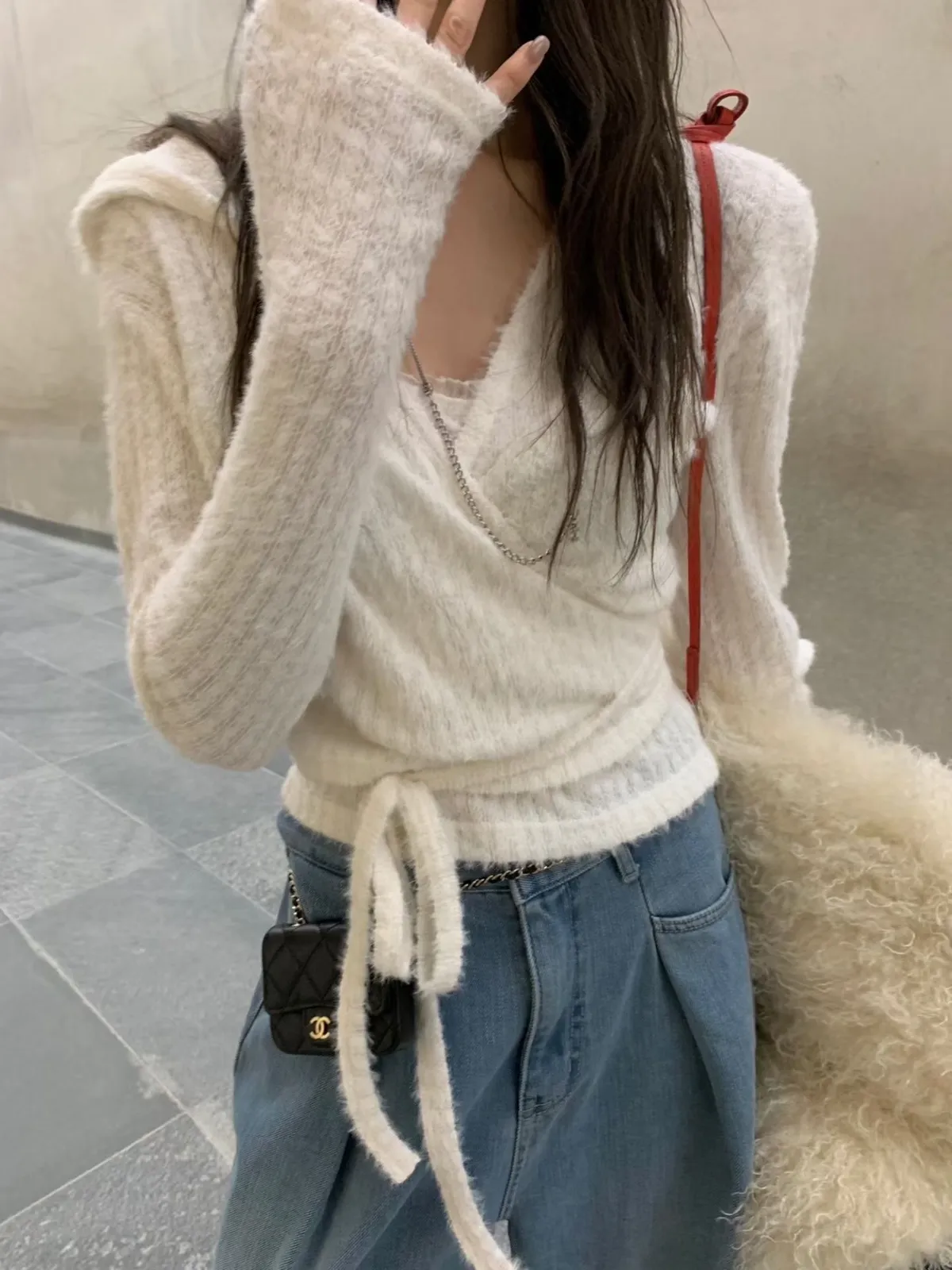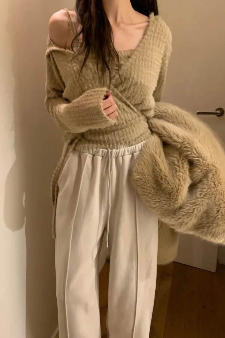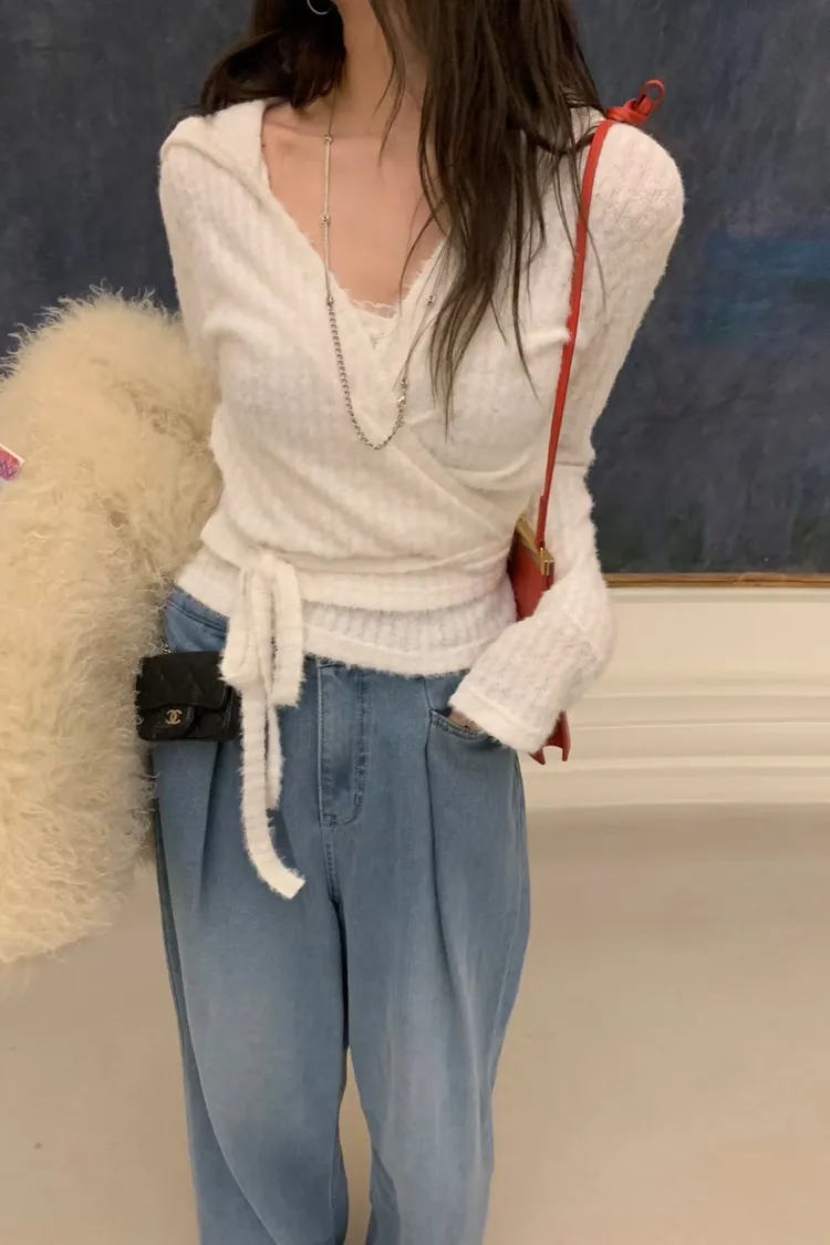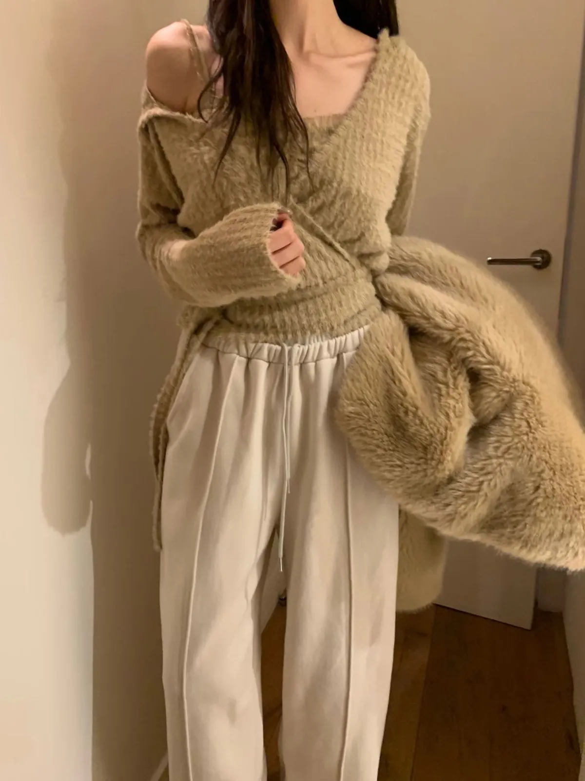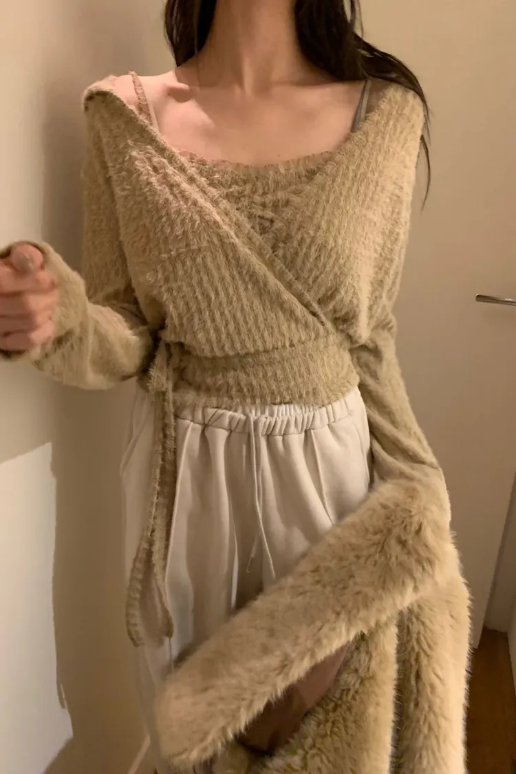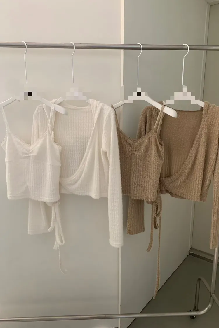 可愛到不行的一整套🎀 抓皺背心甜甜的、連帽罩衫隨性又修飾 兩件可以一起穿,也能分開搭配 摸起來是水貂毛質感、肩帶拼紗設計 懶人直接套上就很有造型感,週末穿它剛剛好💗 尺寸 罩衫 肩47/胸47/長49 背心 胸38-49/長46