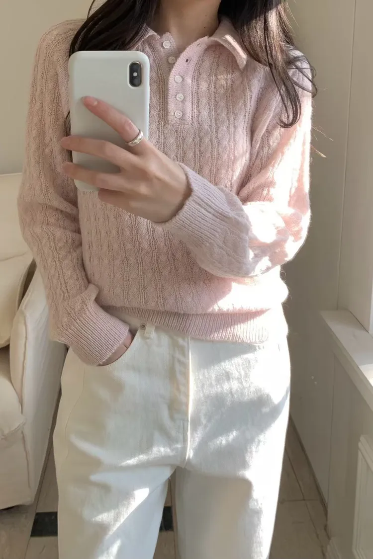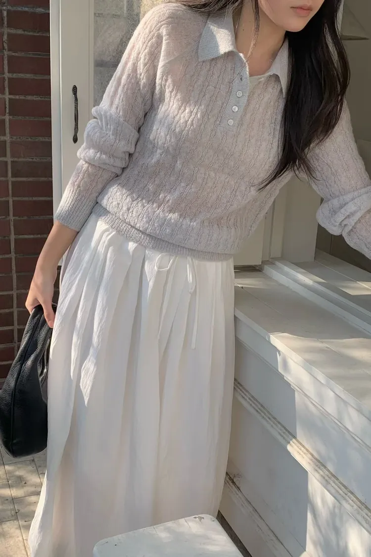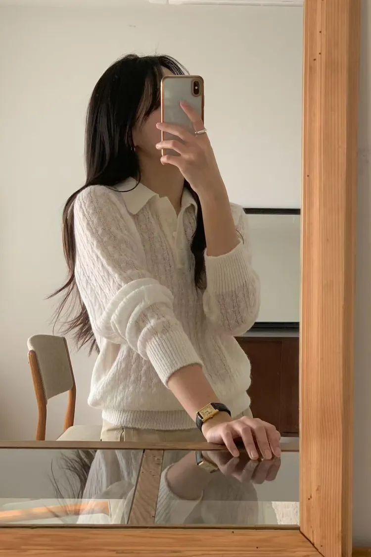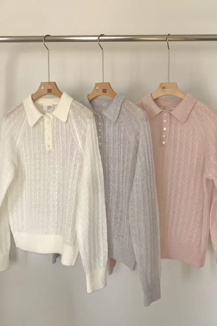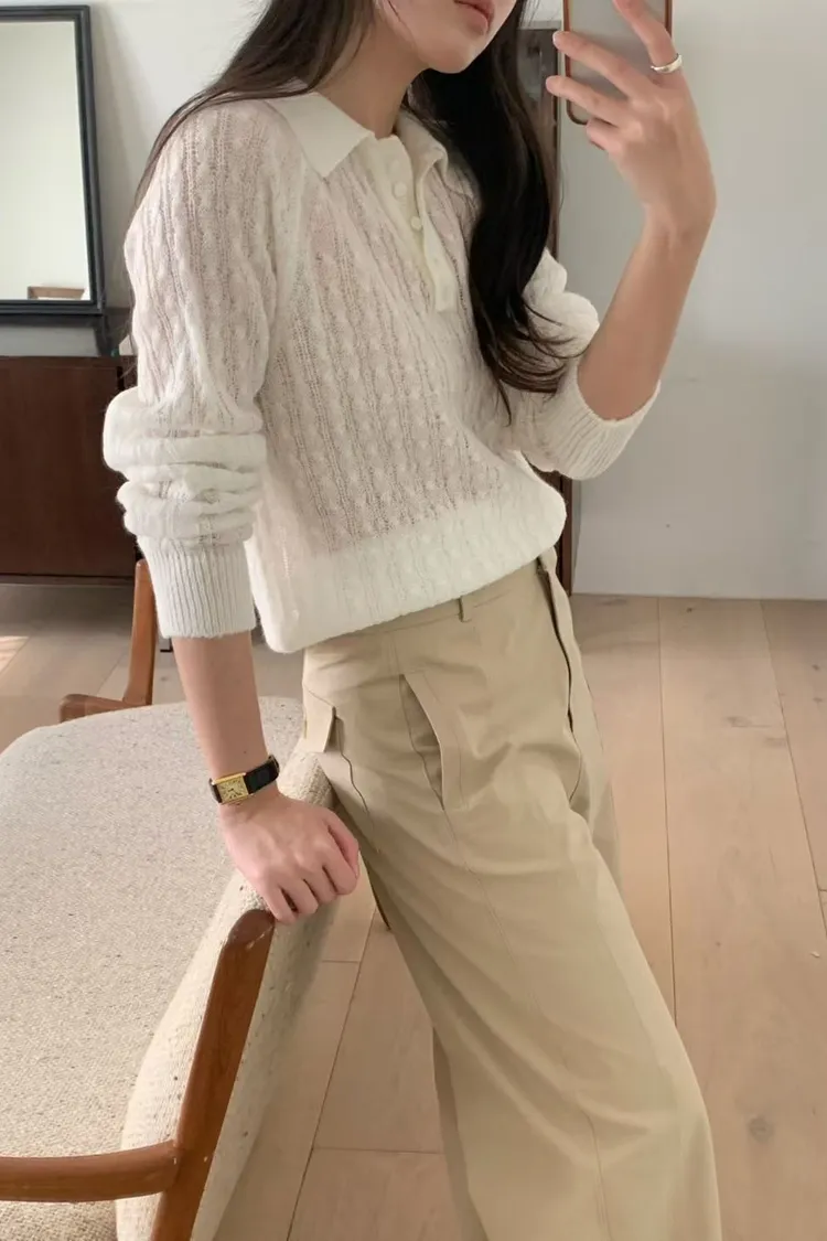 POLO領微透膚針織長袖上衣