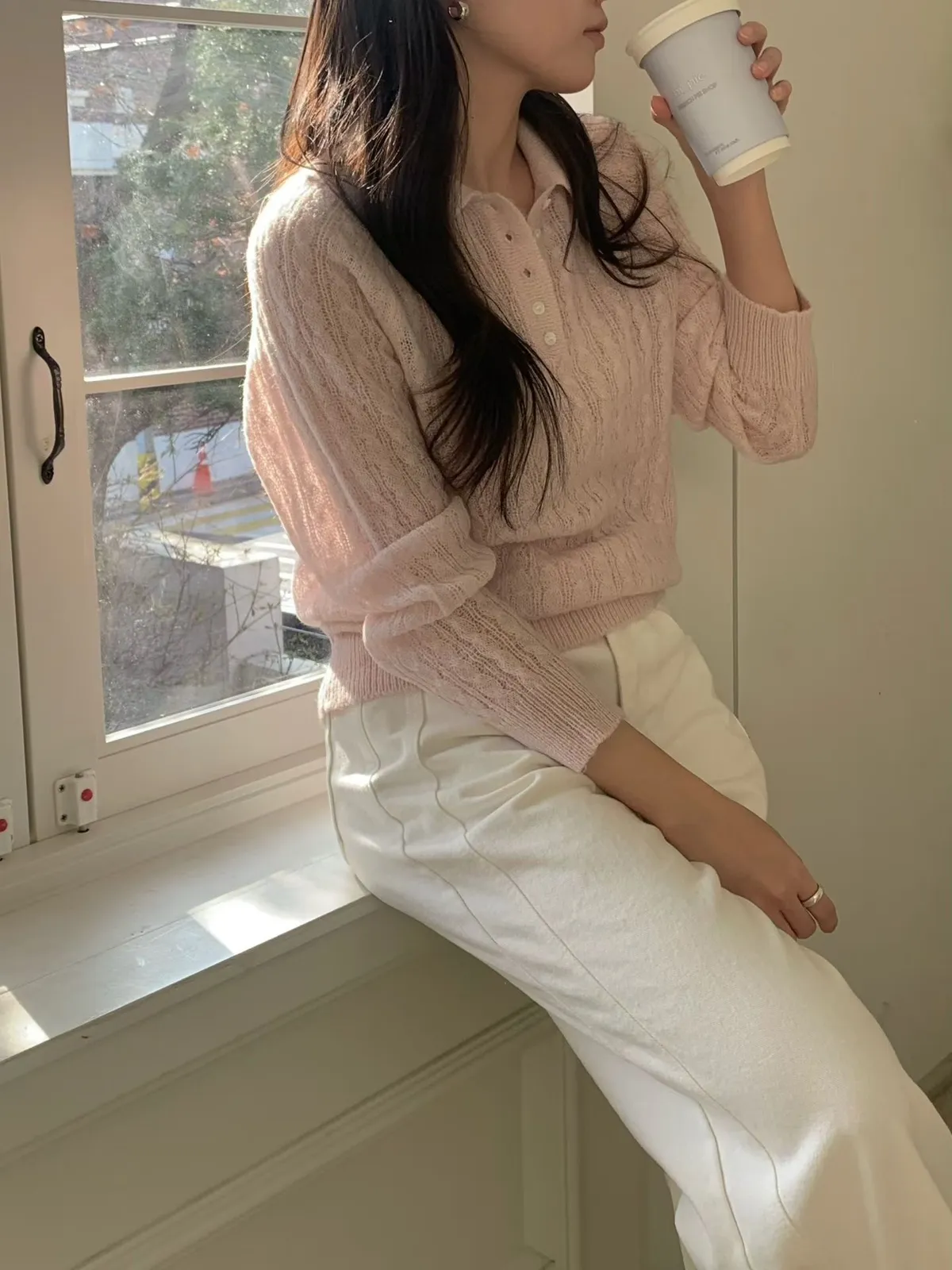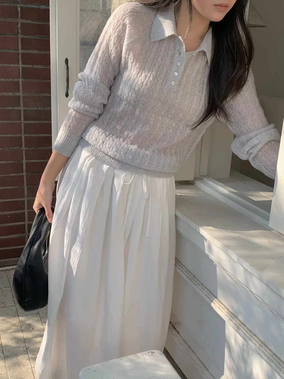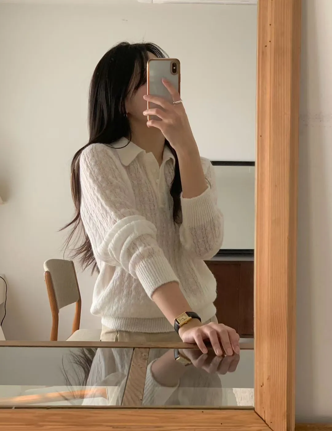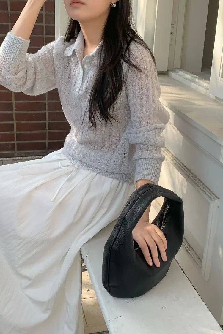 POLO領微透膚針織長袖上衣